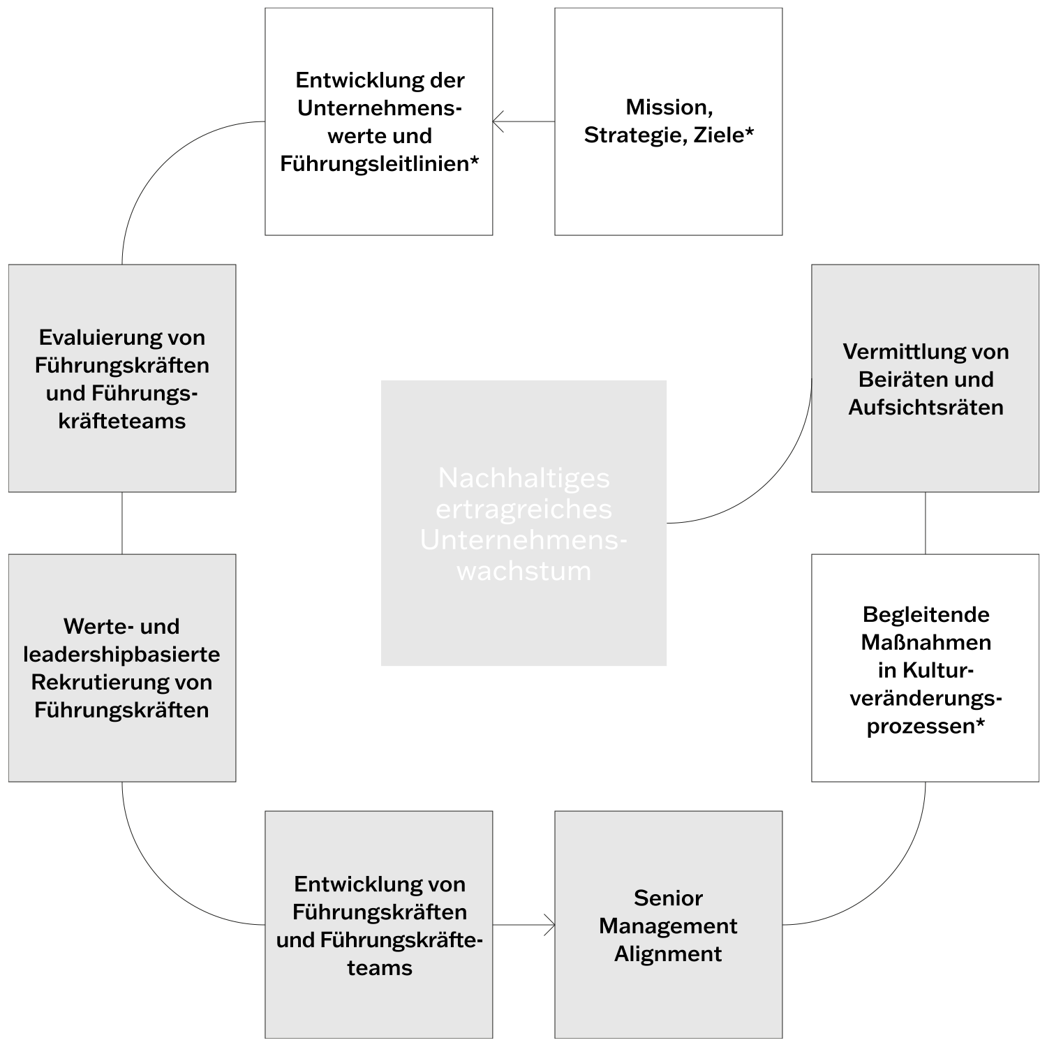 Im Dialog mit den Gesellschaftern, der Unternehmensführung und den Mitarbeiterinnen und Mitarbeitern beraten wir Klienten in der Entwicklung von Unternehmenswerten und Führungsleitlinien und deren Einbettung in die Unternehmensvision.